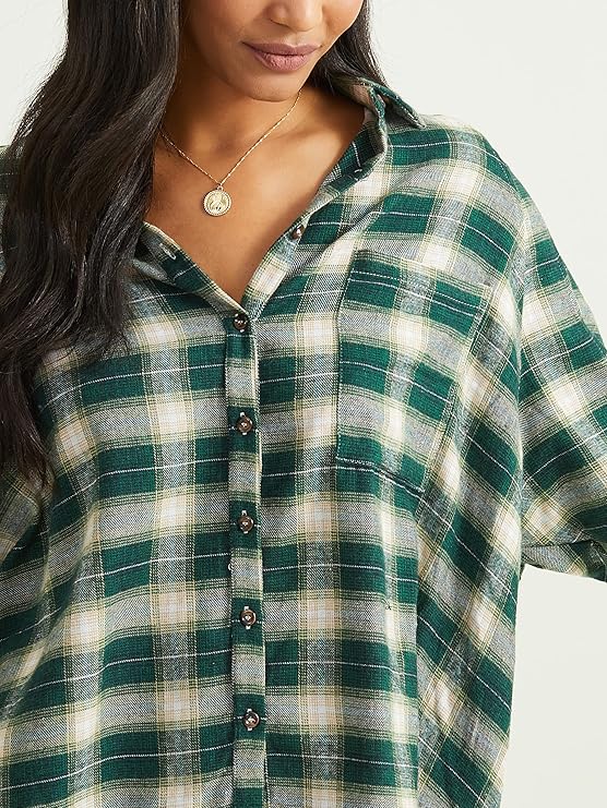 Altar’d State Women’s Oversized Button-Up Flannel Shirt – Green, Long-Sleeve Plaid Collared Shirt